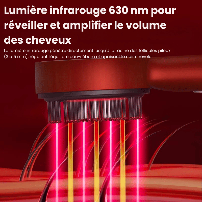 🔴 Technologie lumière infrarouge 630nm : Active la circulation sanguine et réveille les follicules capillaires pour une repousse plus dense.